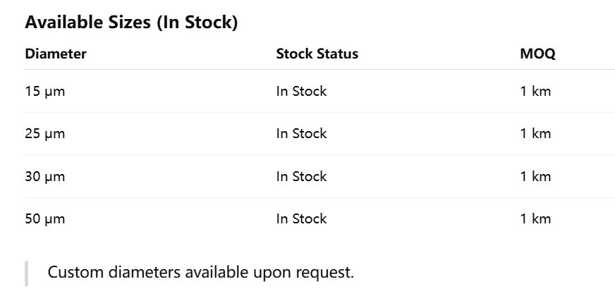 • Gudang kami saat ini menyediakan kawat tungsten ultra halus dengan diameter mulai dari 15μm hingga 50μm, tersedia untuk pengiriman cepat. Dengan jumlah pesanan minimum hanya 1 km, kawat tungsten kami sangat ideal untuk pelanggan yang membutuhkan pengadaan dalam jumlah kecil, percobaan R&D, atau pasokan jangka panjang yang stabil.
